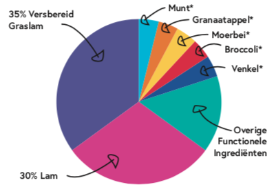 *35% Versbereid Graslam, 24% Gedroogd Lam, 6% Lamsvet